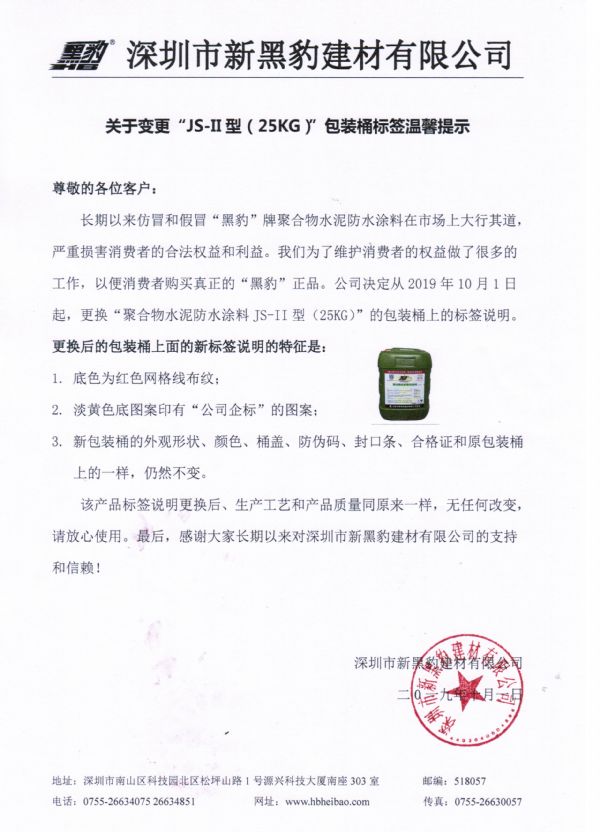 尊敬的各位客户: 长期以来仿冒和假冒“黑豹”牌聚合物水泥防水涂料在市场上大行其道,严重损害消费者的合法权益和利益。我们为了维护消费者的权益做了很多的工作,以便消费者购买真正的“黑豹”正品。公司决定从2019年10月1日起,更换“聚合物水泥防水涂料JS-II型(25KG)”的包装桶上的标签说明。 更换后的包装桶上面的新标签说明的特征是: 1. 底色为红色网格线布纹; 2. 淡黄色底图案印有“公司企标”的图案; 3. 新包装桶的外观形状、颜色、桶盖、防伪码、封口条、合格证和原包装桶上的一样,仍然不变。 该产品标签说明更换后、生产工艺和产品质量同原来一样,无任何改变,请放心使用。最后,感谢大家长期以来对多宝网页版的支持和信赖! 多宝网页版 二0一九年十月一日