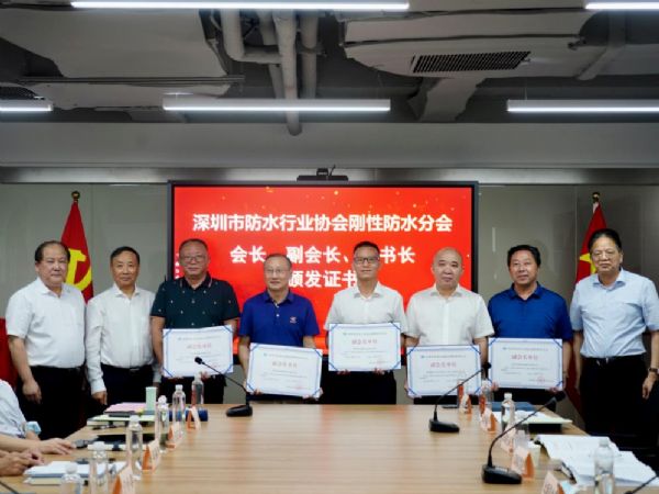 2022-7-30,深圳设计大厦华旗会议室,“深圳市防水行业协会刚性防水分会暨国控基业(北京)科技有限深圳分公司揭牌仪式”成立大会召开。深圳市防水行业协会会长瞿培华致辞。深圳城市建设类行业联合党委第一书记胡建文发表讲话。中国建筑防水协会驻会副会长羡永彪、巢文革、朱德明,深圳土木学会秘书长刘福义、深大设计院教授张道真、江西防水协会秘书长宁小春、福建防水协会会长李文芳、海南防水协会会长邓锡华、深总院湾区院院长王启文受邀出席并讲话。任命国控基业高进军为刚性防水分会会长,上海凯顿百森王凌琨为秘书长,北新防水陈立华、新黑豹王荣柱、先泰实业邓腾、欣生沸石杜桂林、华捷新材料宛斌、广东邦润曹永会为副会长,29家会员单位代表参会,深圳防水协会秘书长杨鸣主持会议。国控基业深圳分公司同期举行揭牌仪式,执行总经理高宽讲话。