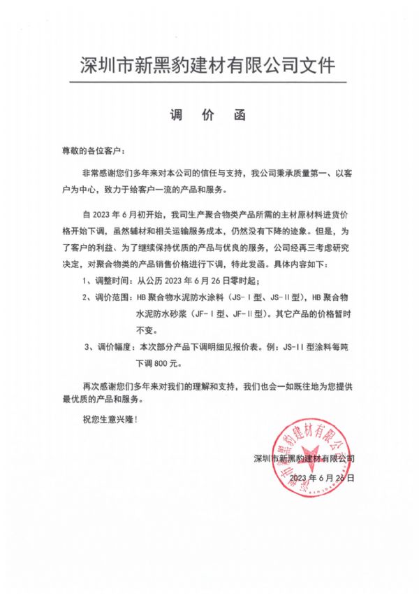 尊敬的各位客户: 非常感谢您们多年来对本公司的信任与支持,我公司秉承质量第一、以客户为中心,致力于给客户一流的产品和服务。 自2023年6月初开始,我司生产聚合物类产品所需的主材原材料进货价格开始下调,虽然辅材和相关运输服务成本,仍然没有下降的迹象。但是,为了客户的利益、为了继续保持优质的产品与优良的服务,公司经再三考虑研究决定,对聚合物类的产品销售价格进行下调,特此发函。具体内容如下: 1、调整时间:从公历2023年6月26日零时起; 2、调价范围:HB聚合物水泥防水涂料(JS-Ⅰ型、JS-Ⅱ型),HB聚合物水泥防水砂浆(JF-Ⅰ型、JF-Ⅱ型)。其它产品的价格暂时不变。 3、调价幅度:本次部分产品下调明细见报价表。例:JS-II型涂料每吨下调800元。 再次感谢您们多年来对我们的理解和支持,我们也会一如既往地为您提供最优质的产品和服务。 祝您生意兴隆! 多宝网页版 2023年6月25日