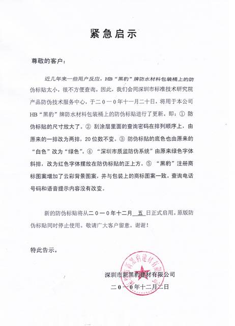 黑豹”牌防水材料包装桶上的防伪标贴进行了更新